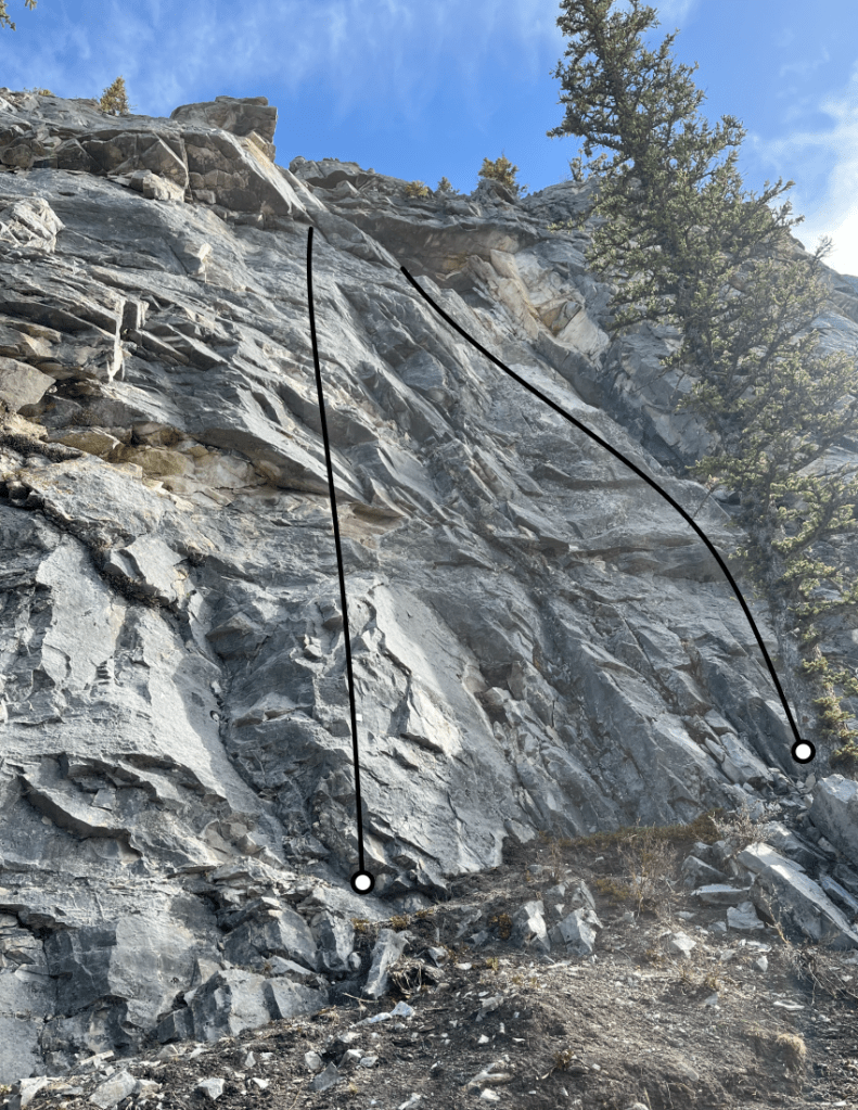 Route on the left pictured below. Keep the bolts on your left side, but don’t stray too far into the chossy corner. Utilize the undercling to reach the juicy pockets above.