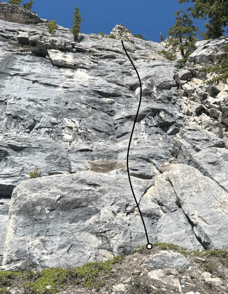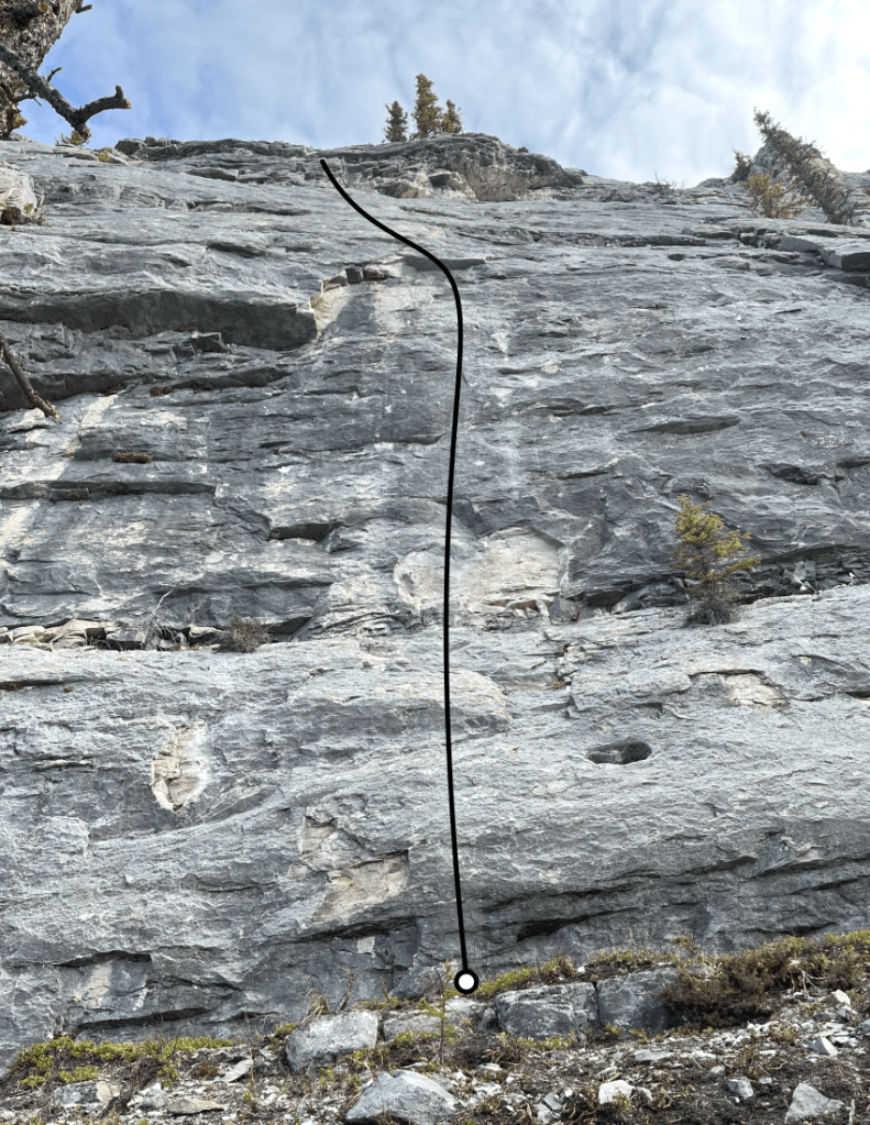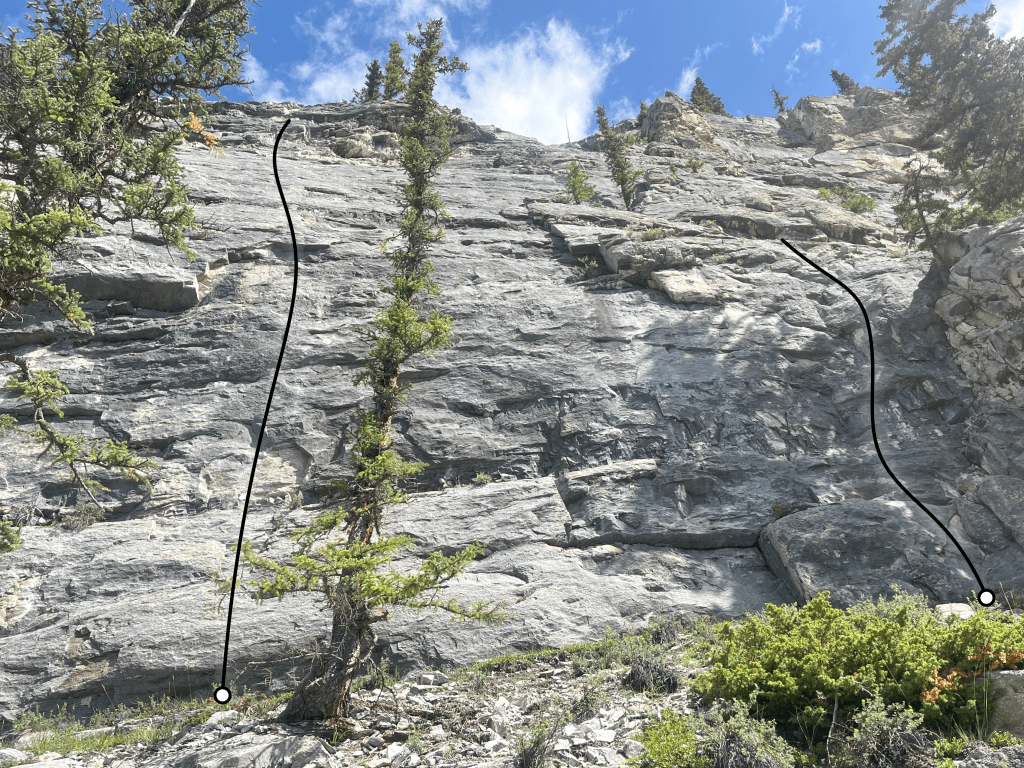 The photo below shows both climbs, Hell Interface is the route on the left, and Cosmic Noon is the route on the right.