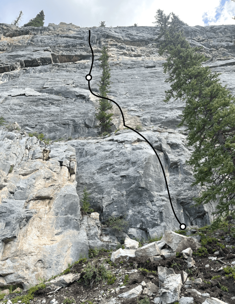 Ya Ha Crag now has a muti-pitch route! It is now the furthest east climb to date, and this section of cliff is a new area – Red Deer Wall. The climb starts with a short “access pitch” to gain a comfortable ledge. Depending on your stamina and/or tolerance for rope drag, there are multiple options for linking that make this a two pitch climb. Otherwise, the route can be done in the three short pitches. The cruxes are generously bolted.